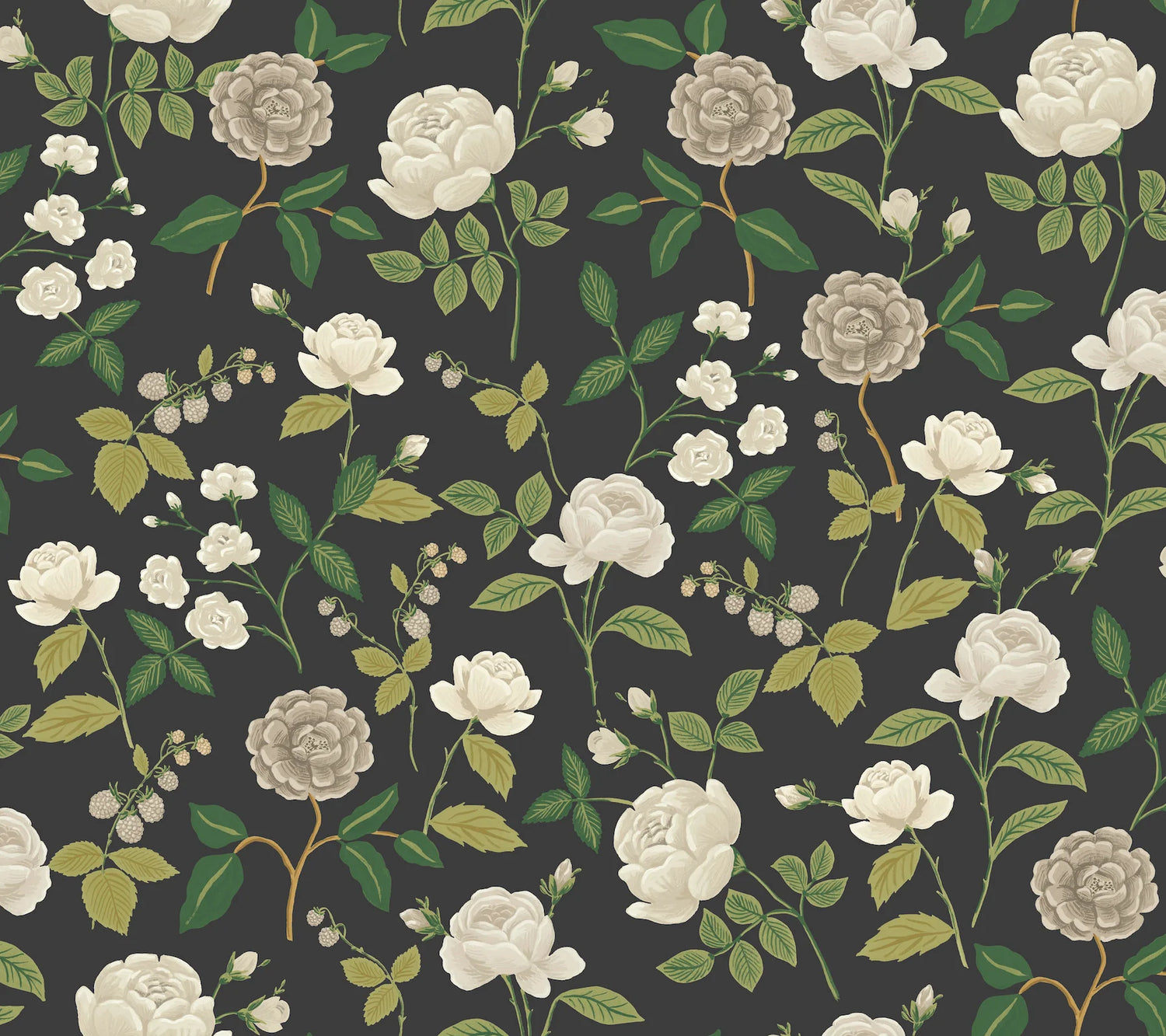 Inspired by vintage botanical drawings, Roses is a timeless pattern filled with layered details, classic colors, and playful stems of raspberries. Illustrated in shades of lavender, blush, merlot, sage, and moss against a cream backdrop./lavender, white, dove, lime, sage, and moss against a black backdrop./blue, delicate grey, and rich greens against a cool white backdrop./pink, rose, buttery yellow, and green against a navy backdrop./pinks and greens against a pale sage backdrop./pink, rose, buttery yellow, and green against a cool white backdrop.