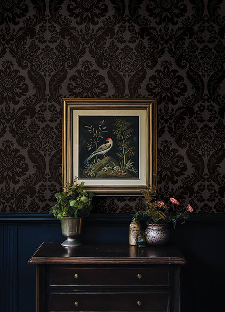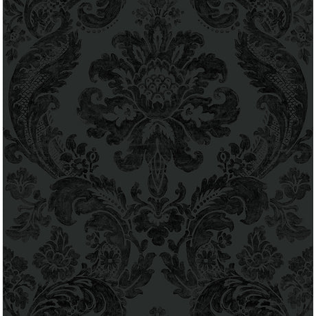 Shadow Black Flocked Damask Wallpaper - Scroll Wallpaper