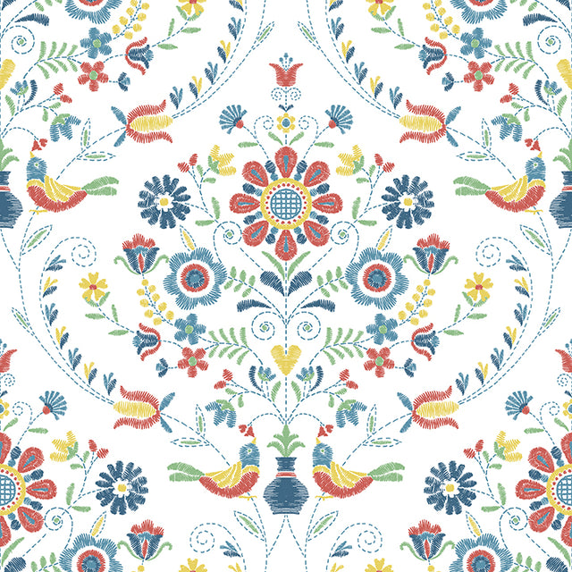 Britt Multicolor Embroidered Damask Wallpaper - Damask Wallpaper