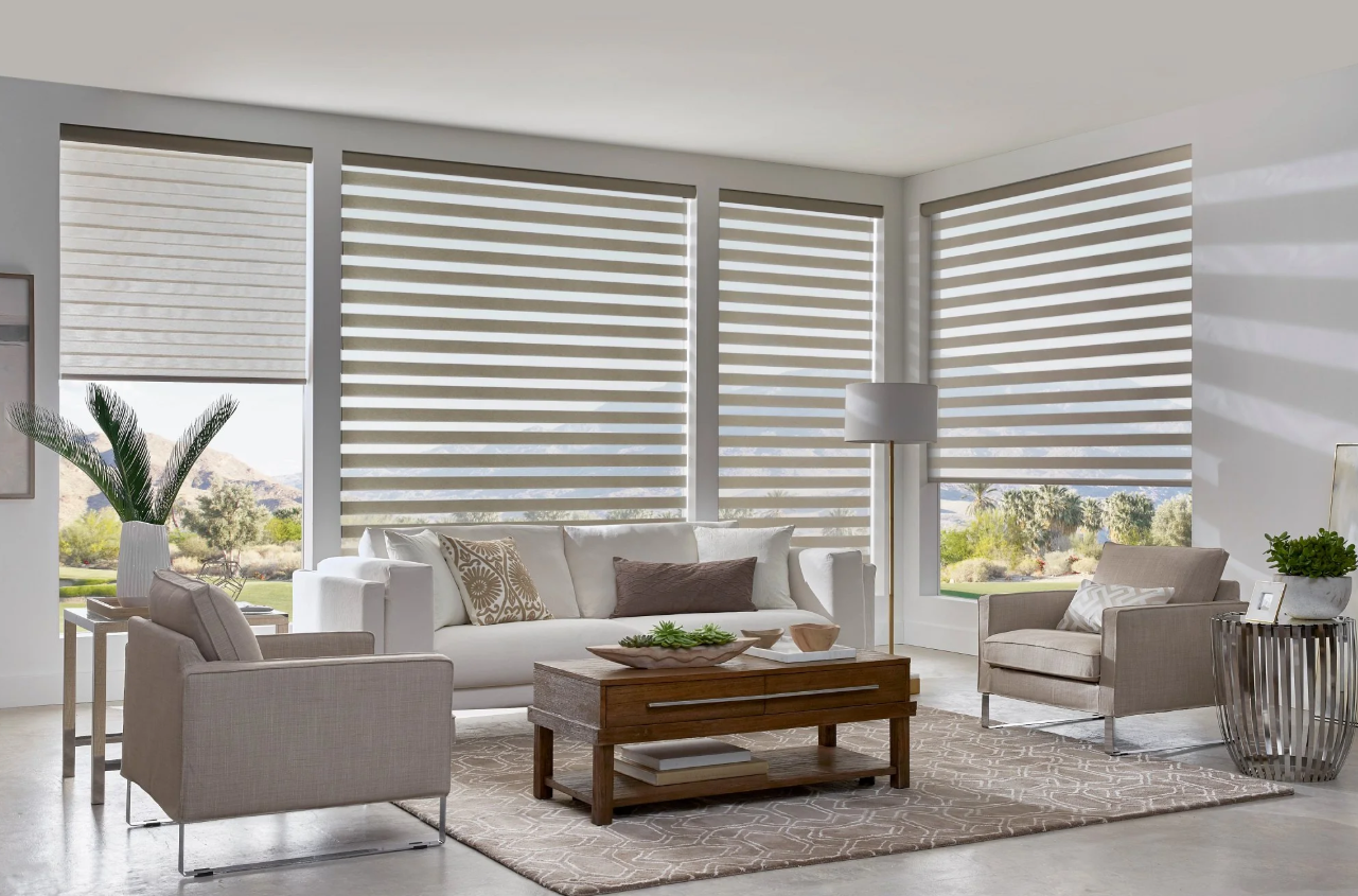 Alta banded shades—also called zebra or dual shades—are one of the most popular modern window treatments. Alternating bands of sheer and solid fabric let you transition seamlessly between view-through and privacy.