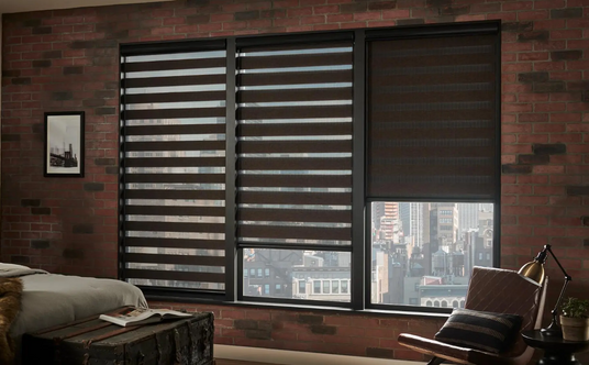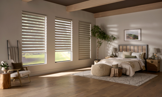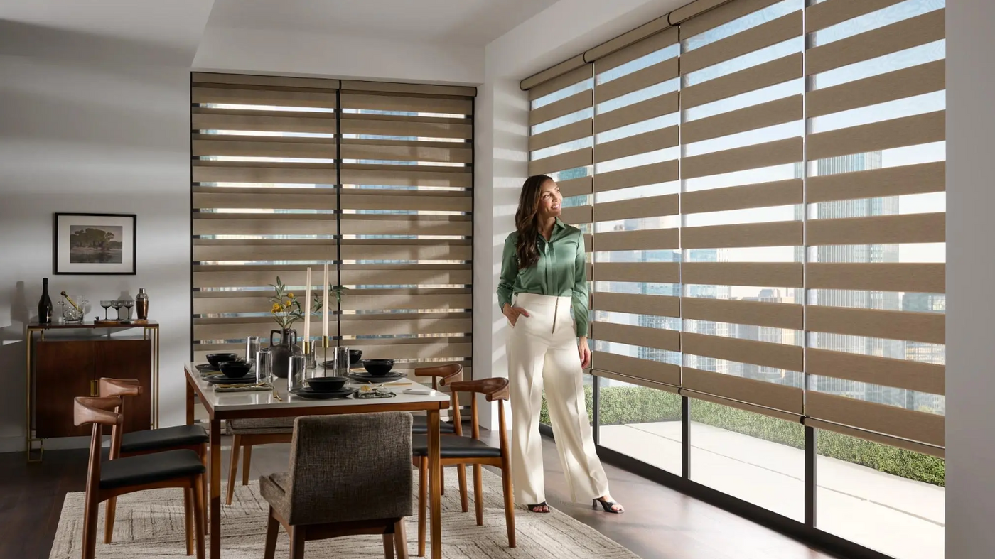 Alta Banded Shades combine contemporary aesthetics with practical light control. The dual-layer fabric system features alternating horizontal bands: