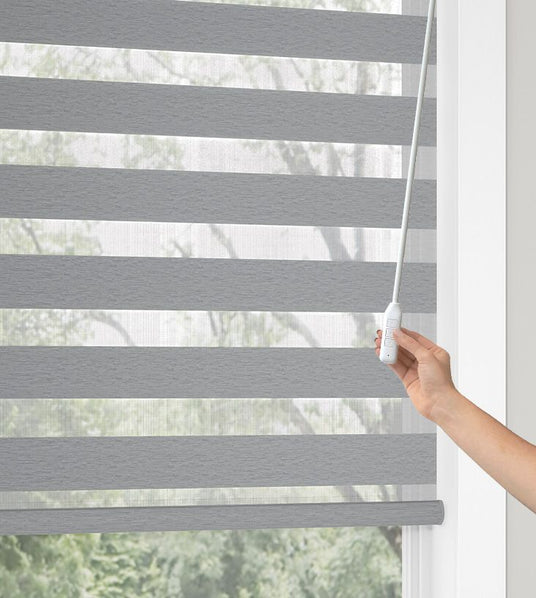 Alta banded shades—also called zebra or dual shades—are one of the most popular modern window treatments. Alternating bands of sheer and solid fabric let you transition seamlessly between view-through and privacy.