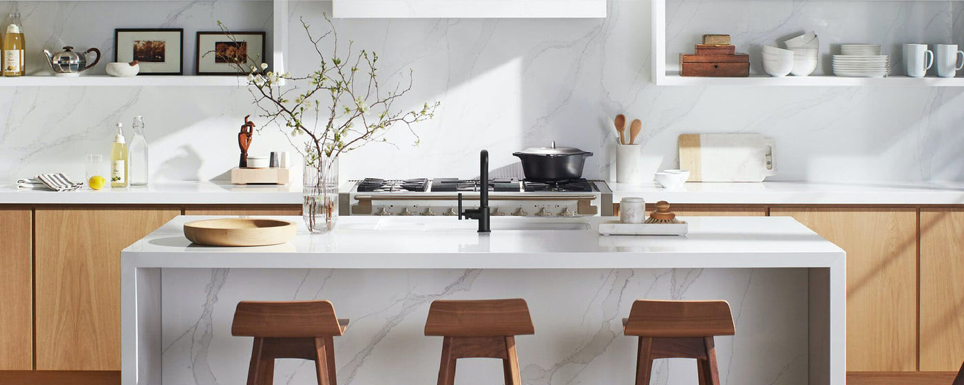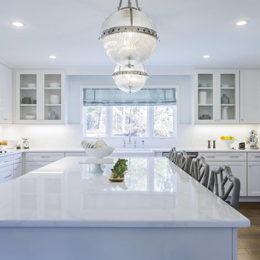 Unlike Natural Stone, Quartz countertops are man-made and consist of quartz chips or quartz dust bound by resin. It makes for an extremely durable countertop.