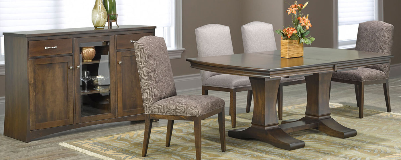 Custom-made wood dining furnitureHandcrafted by Cardinal Woodcraft Inc. in Ontario, their tables, chairs, benches, and sideboards are solid wood. They are made-to-order to your specifications. You pick the style, wood type, stain, configuration, hardware, top texture, profile etc.