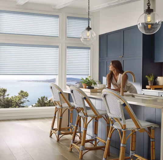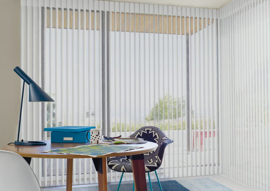 The sheer fabric facing diffuses harsh sunlight, reducing glare and protecting your furniture and floors from UV damage. Even with vanes open, Luminette provides a level of privacy not possible with bare glass.