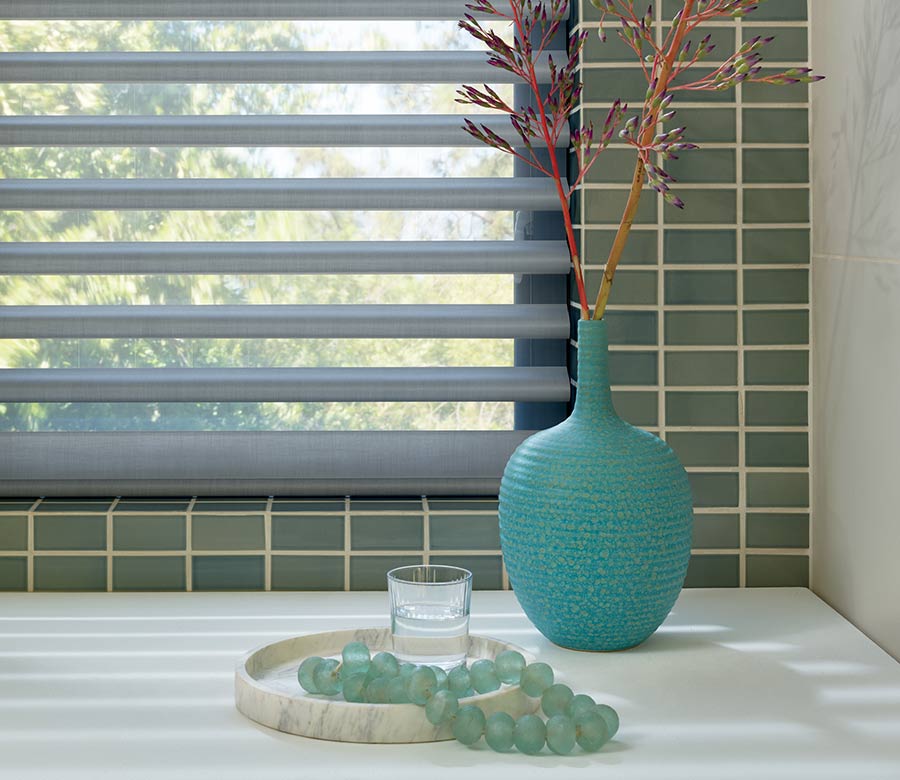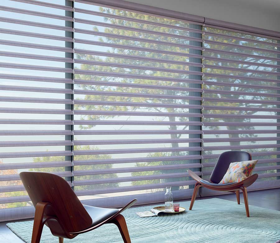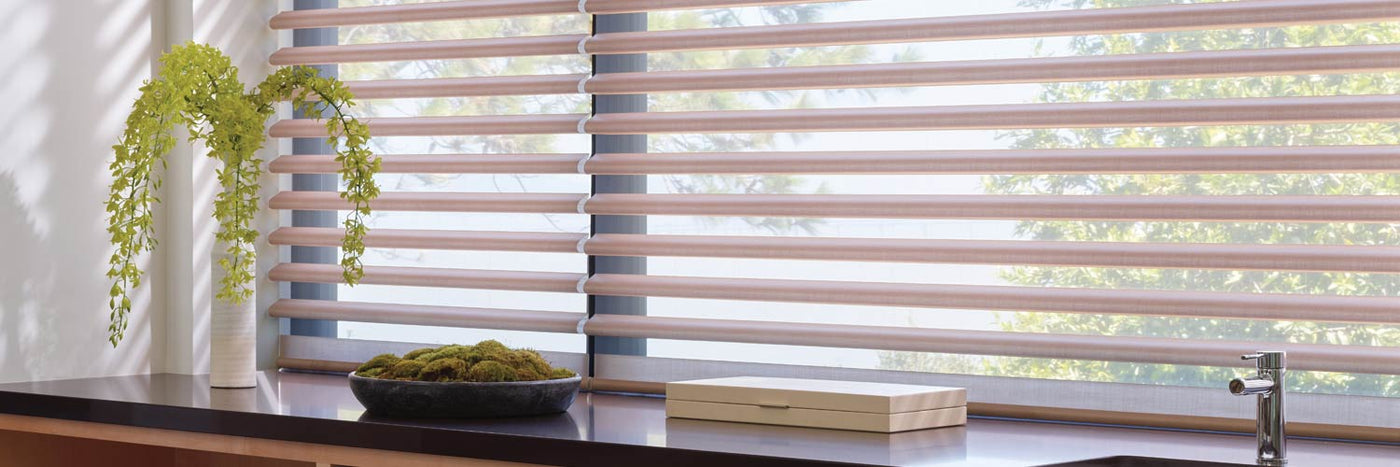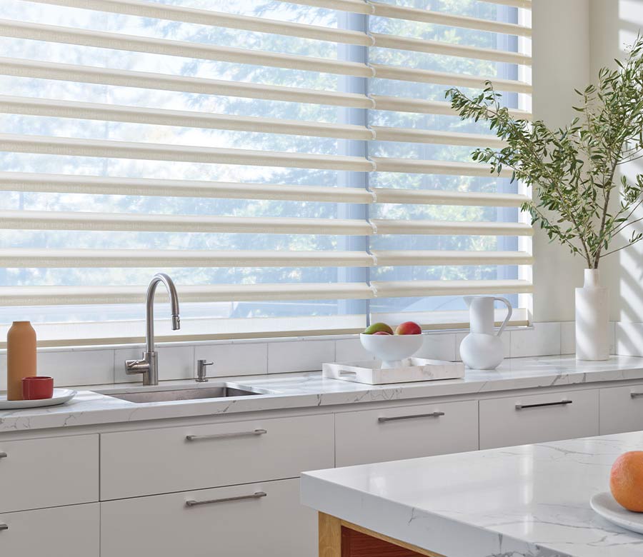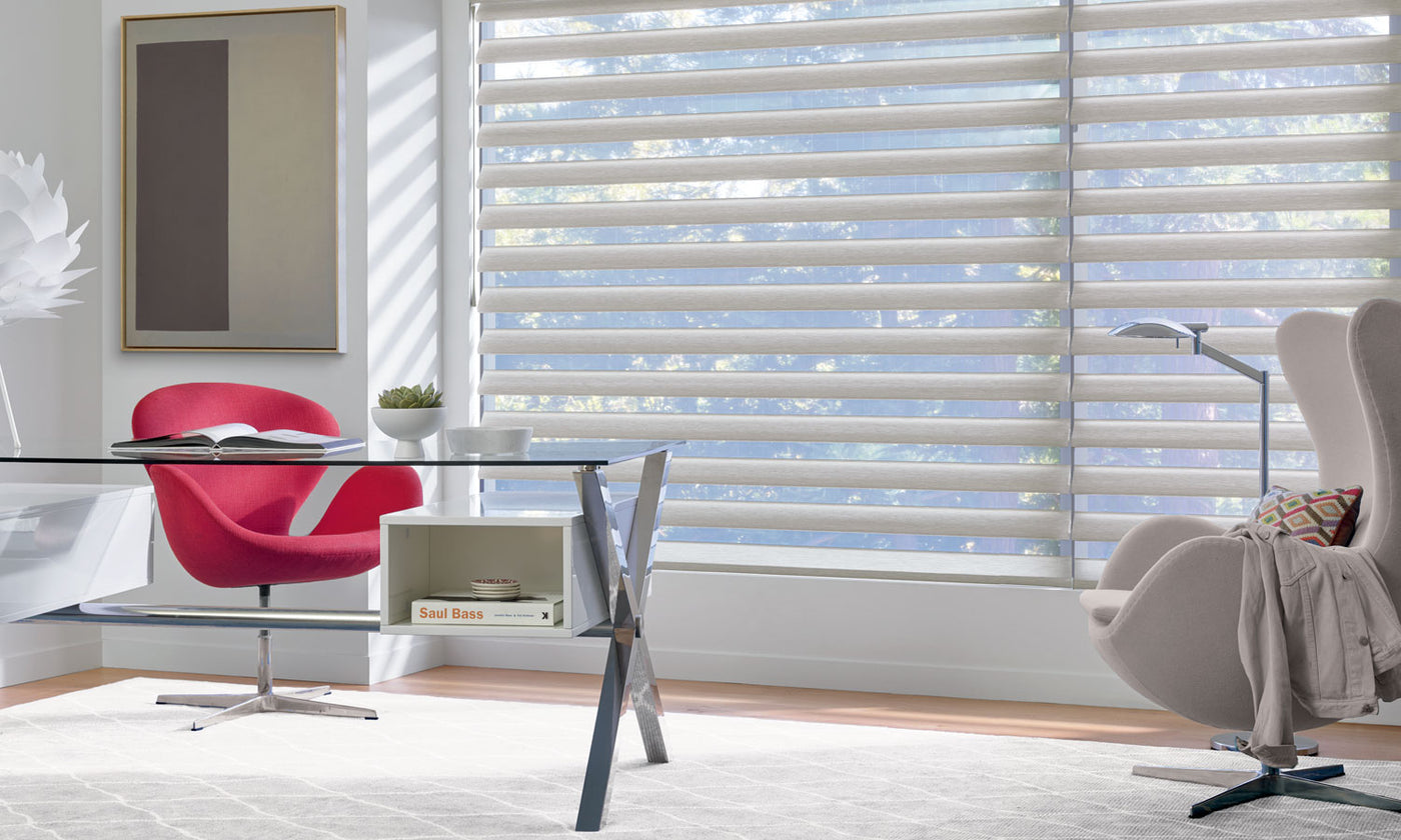 It's a "Wow" at the window. Pirouette shades feature solid fabric vanes that fold in half right where they are, revealing a view of the outdoors through sheer fabric backing. This sheer backing diffuses incoming light, for a comfortable atmosphere. When the Pirouette shades are closed fully, the fabric vanes are flattened, mimicking the overlapping fabrics of roman shades. Perfectly capable of blocking light, depending on the fabrics you select, you can enjoy light filtering or room darkening. The sheer fabrics filter incoming light when the vanes are opened. Roll the entire Pirouette shade into the headrail to make it disappear.