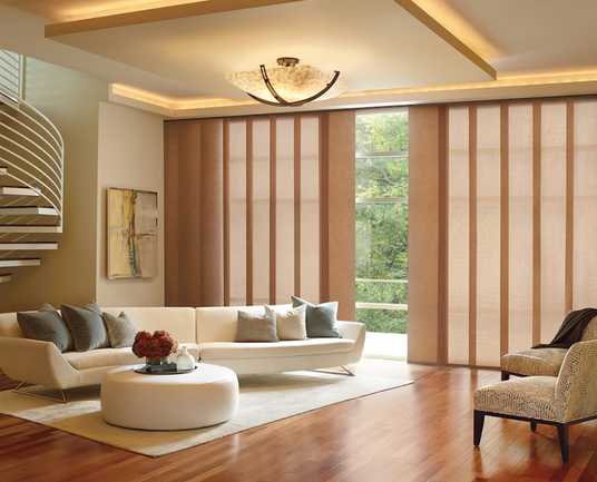- Skyline® Gliding Window Panels: Modern panel track system with sleek, contemporary appeal. Large fabric panels glide smoothly on tracks—ideal for room dividers and wide expanses.